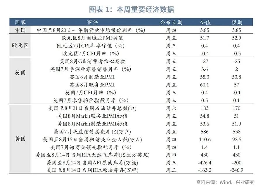 本周各国公布的经济数据总体比较平稳。美国劳工部公布,上周首次申领失业救济人数意外大增13.5万人,至110.6万人,高于预期的92.3万人,时隔一周重返百万以上。欧元区7月调和CPI同比终值 0.4%,预期 0.4%,初值 0.3%。欧元区7月通胀率较上年同期小幅上升,核心指标飙升。中国方面,7月中国商品零售额达2.9万亿元,同比增长0.2%,增速今年以来首次实现由负转正。其中,汽车市场销售明显回暖,限额以上单位汽车类商品零售同比增速比上月大幅反弹20.5个百分点。