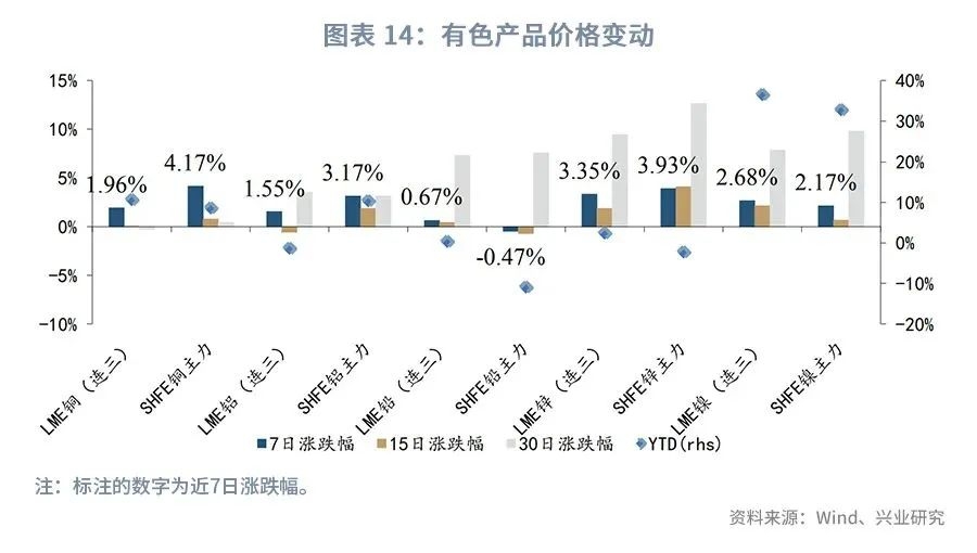 走势回顾:本周有色金属价格涨跌不一。本周伦铜上涨1.96%,沪铜上涨4.17%;伦铝上涨1.55%,沪铝上涨3.17%;伦铅上涨0.67%,沪铅下跌0.47%;伦锌和沪锌分别上涨3.35%和3.93%;伦镍上涨2.68%,沪镍上涨2.17%。