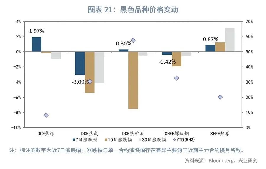 本周黑色品种涨跌不一,焦煤跌1.97%,焦炭跌3.09%,铁矿石涨0.30%,螺纹钢跌0.42%,热卷涨0.87%。