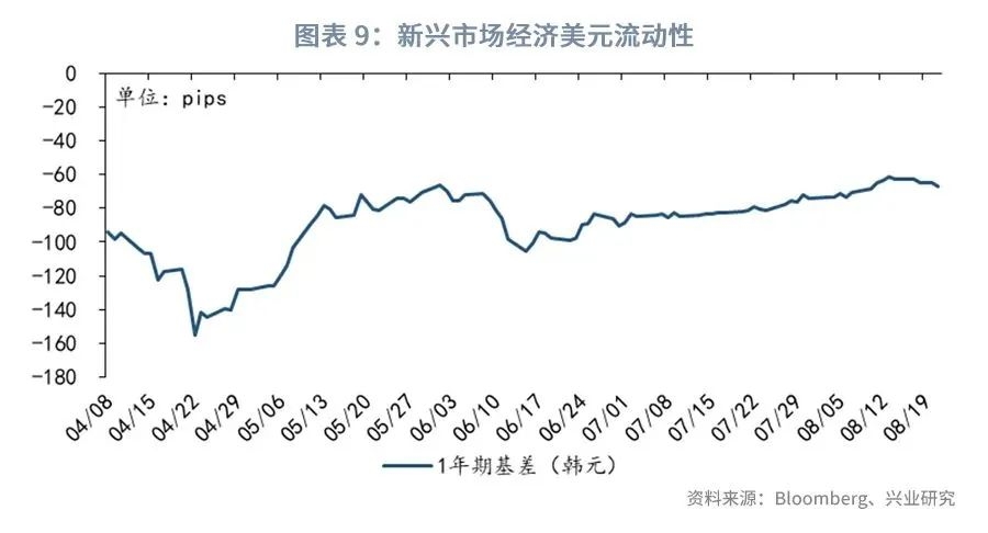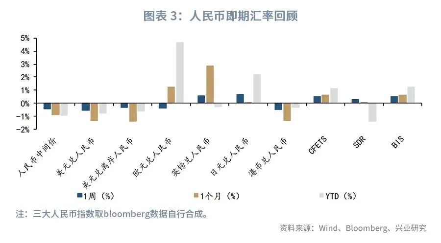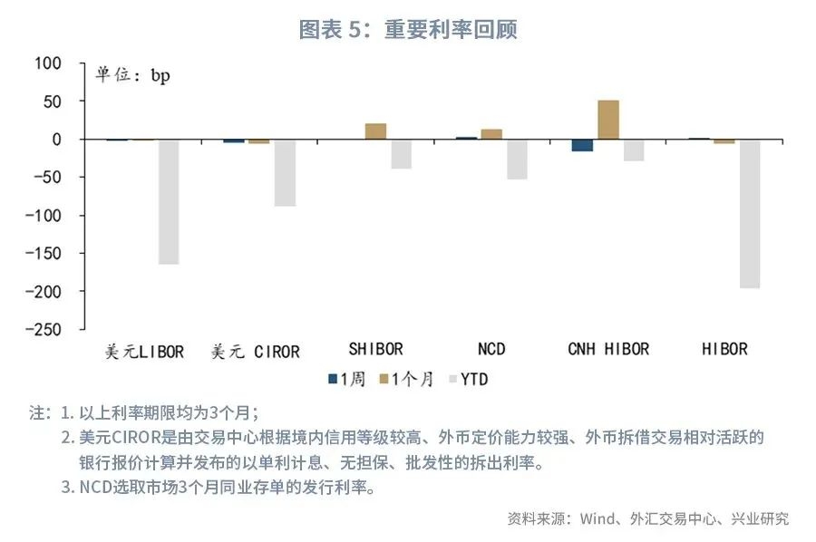 流动性方面,本周3个月LIBOR下行11.7bp,一个月CIROR下行5bp,掉期市场基差略有走低,美元流动性依旧较为宽松。本周央行共计开展6600亿元逆回购操作、7000亿元MLF操作、500亿元国库现金定存操作,同期有5000亿元逆回购、4000亿元MLF和500亿元国库现金定存到期。从全口径看,央行公开市场本周实现净投放4600亿元。一个月SHIBOR上行12.78bp,显示境内流动性边际收紧。境内外掉期点数在回调后高位震荡,掉期价差小幅收敛至159pips,境内外远期价格趋于一致,远期价差(境外-境内)消弭并小幅倒挂。