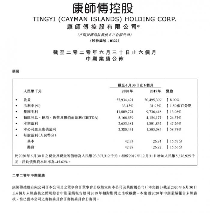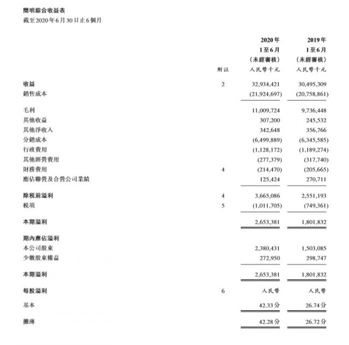 近日,康师傅(0322.HK)公布2020年上半年业绩。报告期内,公司实现收入329.34亿元,同比增长8%;净利润23.8亿元,同比上涨58.4%,创下历史新高;毛利率33.43%,同比上升1.5%。