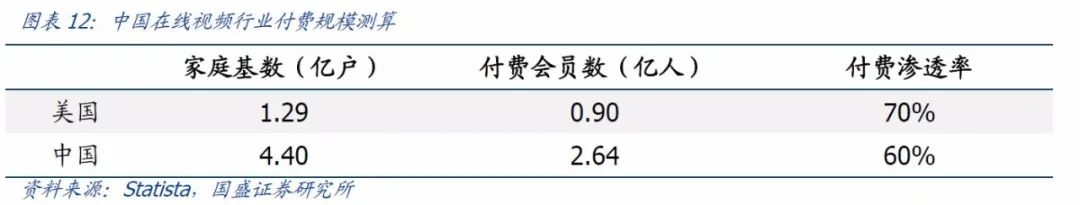 对比成熟的美国市场,我们或许可以做出更乐观的判断。国盛证券的数据显示,截止去年底,美国家庭数共约1.29亿,目前测算Netflix在美国的付费率为45.3%,付费会员数量仍有增长空间,Netflix曾预期美国付费用户数区间为6000万-9000万,如果以9000万的上限计算,其付费渗透率的上限大约为70%,9000万目标与美国单个有线电视频道订阅用户数颇为吻合。