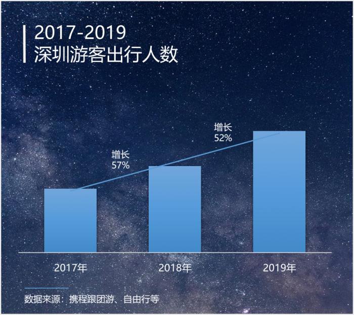 从周边游、国内游到出境游,从跟团到自由行、定制游,从线下门店到互联网、手机端,不断出现的创新旅行方式,完全改变了深圳人的旅游与生活。数据显示,2017年来深圳游客出行人数同比增长均超过50%,2019年相比2016年来看,增长超过了150%。深圳人的脚步在2019年遍布全球80多个国家,1000多个目的地。旅游在深圳人“购物清单”上的位置越来越靠前,也逐渐从奢侈品走向了生活必需品。