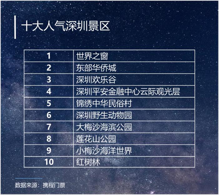 目前,深圳人有超过90%使用手机预订景区门票,其中最受喜爱的深圳本地景区分别是世界之窗、东部华侨城、深圳欢乐谷、深圳平安金融中心云际观光层、锦绣中华民俗村、深圳野生动物园、大梅沙海滨公园、莲花山公园、小梅沙海洋
