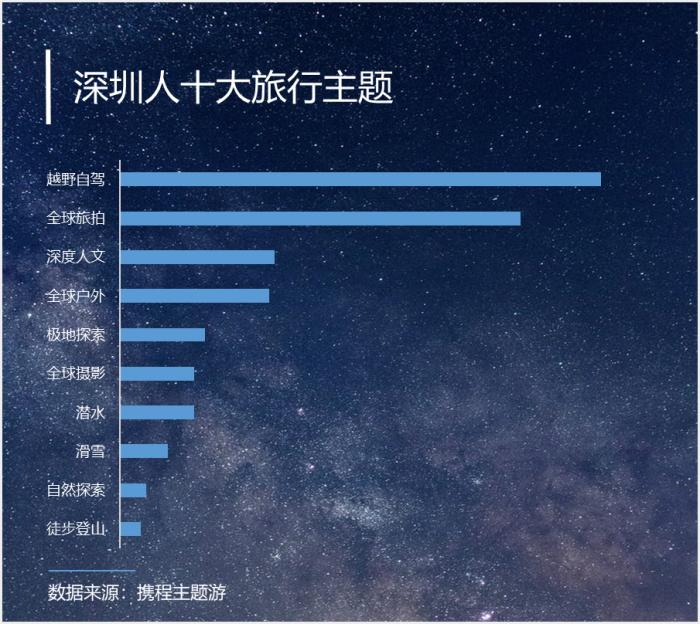 根据携程主题游数据,2019年深圳人主题游十大类型分别是越野自驾、全球旅拍、深度人文、全球户外、极地探索、全球摄影、潜水、滑雪、自然探索和徒步登山。