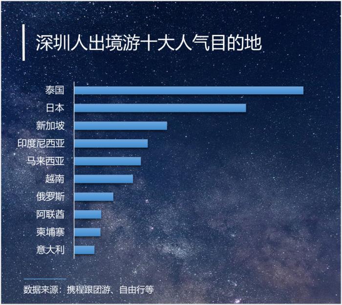 在2019年,深圳人通过携程预订到达全球80多个国家和地区,其中最受欢迎的目的地分别是泰国、日本、新加坡、印度尼西亚、马来西亚、越南、俄罗斯、阿联酋、柬埔寨和意大利。