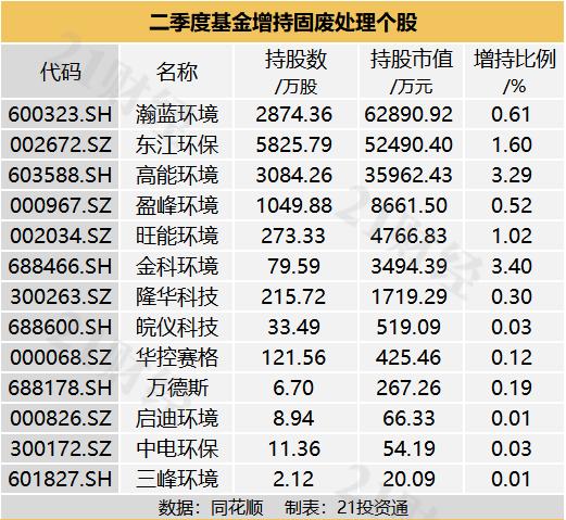 二季度基金持仓数据显示,环保板块中,固废板块资金流入较为显著,共13只个股获增持。其中高能环境(603588)、东江环保(002672)、盈峰环境(000967)为代表的龙头公司备受青睐,机构抱团明显。