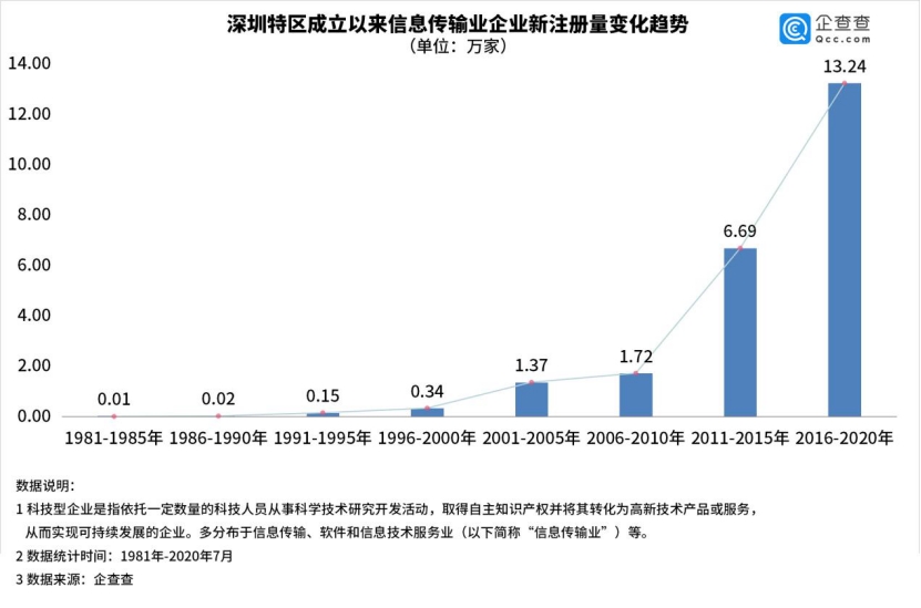 十年努力,带动深圳信息传输业从发展到腾飞。企查查数据显示,近十年(2011年-2020年),深圳市信息传输业共新注册19.9万家,平均每年增加1.8万家,占深圳特区成立以来(1981年-2020年)信息传输业企业新注册总量的84.67%,占近40年深圳企业新注册总量的3.68%,最近十年是深圳信息传输业发展最为迅猛的十年。
