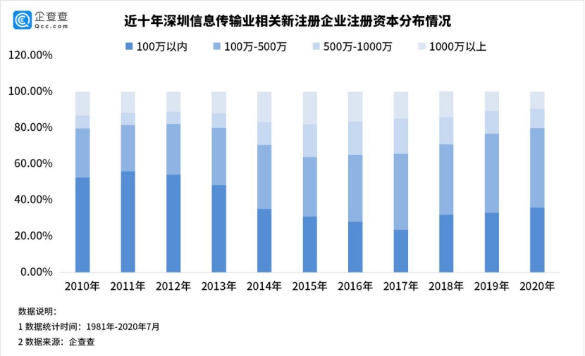 2012年之后,深圳信息传输业进入转型提升、跨越发展的重要时期。企查查数据显示,2010年,深圳信息传输业共新注册3700余家企业,其中注册资本在100万以内的相关企业占新注册总量的52.42%;2012年之后,注册资本在100万-500万的信息传输业新注册企业占比持续走高;2014年,注册资本100万-500万占比首次超过注册资本100万以内,略高0.29%;2019年,注册资本100万-500万占比已达43.89%,注册资本100万以内占比32.94%,二者相差10.94%。从最近的十年来看,深圳自身产业调整和结构转型步伐逐渐加快。