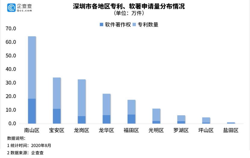 2019年,深圳专利申请量在全国大中城市排名第一。企查查数据显示,2019年深圳国内专利申请量为26.2万件,占全国专利申请量的6.23%,占在全国大中城市排名第一,同比增长14.39%。截至2020年8月,深圳市累计软件著作权申请量达53.4万件,累计专利申请量达141.3万件,分别占全国的12.01%和7.27%。