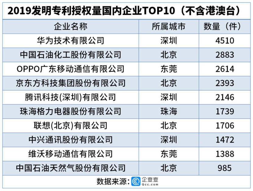 2019发明专利授权量前十国内企业,其中3家位于深圳。企查查数据显示,2019年,中国发明专利授权量排行前十国内企业(不含港澳台)中,共有3家企业位于深圳,依次为华为技术有限公司,腾讯科技(深圳)有限公司和中兴通讯股份有限公司。其中华为技术有限公司发明专利授权量最高,达4510件。