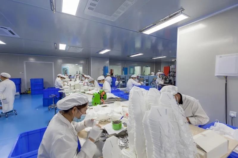 图为广东省柏堡龙股份有限公司无菌车间内,员工正在生产用于出口的防疫物资。