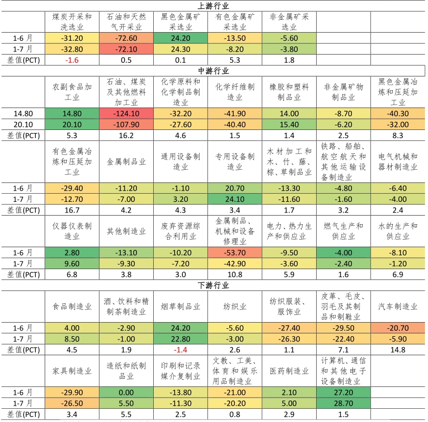 中游行业在投资增长和下游消费回升的拉动下,普遍出现好转。7月基建与房地产投资快速增长,单月分别同比上升7.7%和11.7%,受此影响,工程建筑相关的黑色金属冶炼和压延加工业、非金属矿物制品业、专用设备制造业累计同比利润增速分别较上期增加8.3、2.5和3.4个百分点,至-32%、-6.2%和24.1%。汽车制造业的持续景气带动中游橡胶和塑料制品、通用设备制造业、电气机械和器材制造业利润上涨1.4、4.3和2.4个百分点,达到15.4%、3.2%、-4%。