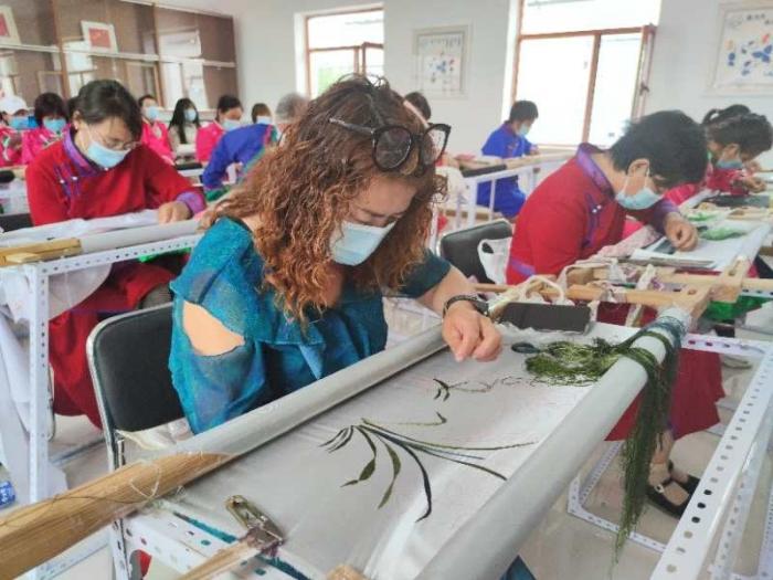 通过统一培训管理、统一材料发放、统一成品回收、统一收入结算的方式,为2.1万名参与蒙古族刺绣产业的农牧民提供服务和保障。2016年以来,在科右中旗173个嘎查集中举办蒙古族刺绣培训班100期,培训绣工14700人次。2019年8月,中国手工刺绣传承创新大会命名科右中旗为“中国手工刺绣创新创业示范基地”“中国蒙古族刺绣文化之乡”,成立“蒙古族刺绣与现代设计创新创意实践基地”,成功举办万人刺绣大会并获得“规模最大的蒙古族刺绣技艺展演活动”大世界基尼斯纪录认证。