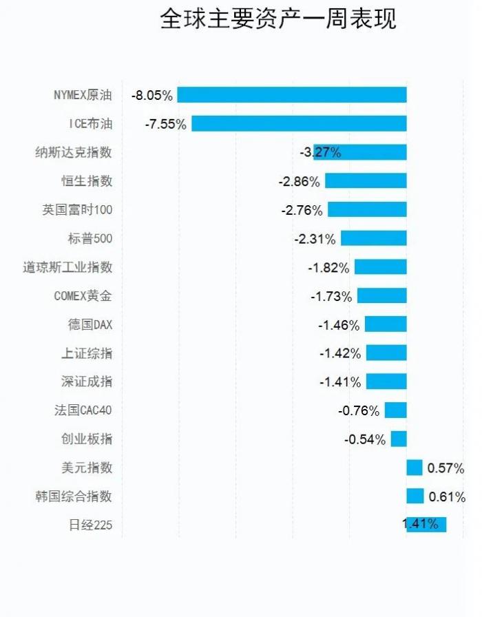 从一周行情来看,道指跌1.82%,纳指跌3.27%,创三月美股闪崩以来最大单周跌幅;标普500指数跌2.31%。美元指数则连涨四日,本周涨0.57%; 受美元上涨影响,美油周跌8.05%,创四月份以来最大单周跌幅;COMEX黄金期货周跌1.72%。