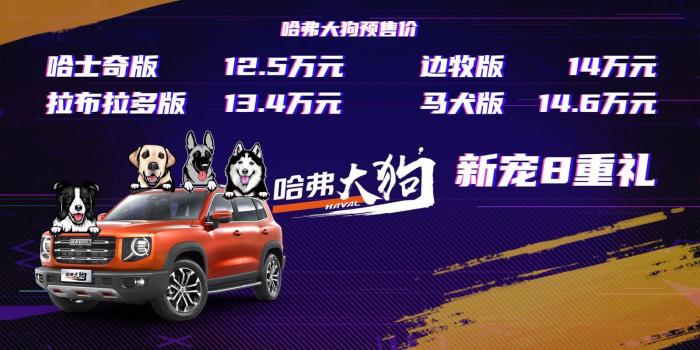 9月5日晚,首个由网友投票命名的车型——长城哈弗旗下全新SUV车型哈弗大狗——正式开启预售,新车共推出四款车型,预售价格12.5万-14.6万元,预计9月25日正式上市。