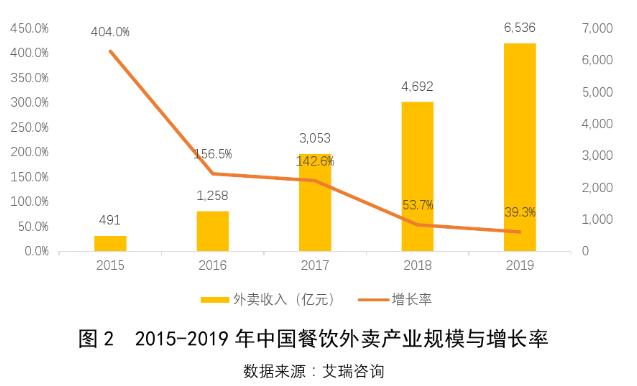 艾瑞咨询数据显示,截至2019年年底,我国餐饮外卖产业规模为6536亿元,同比增长39.3%;我国外卖消费者规模约4.6亿人,同比增长12.7%,在9亿网民中的占比约为50.7%。