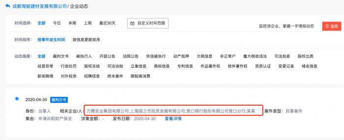 值得关注的是,融资方成都海蛟建材发展有限公司于2020年4月30日被作为当事人牵涉进一桩民事案件,案由是申请诉前财产保全,该案件的相关企业还有,锦宜1号的担保方:万腾实业集团有限公司;安信信托的大股东上海国之杰投资发展有限公司;安信信托的子公司:营口银行股份有限公司营口分行;锦宜1号的担保方:吴昊。