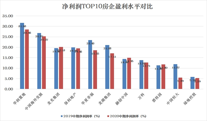 在净利润排名前十的房企中,仅有3家的盈利水平未出现下滑,与房地产行业的整体盈利情况近乎一致。
