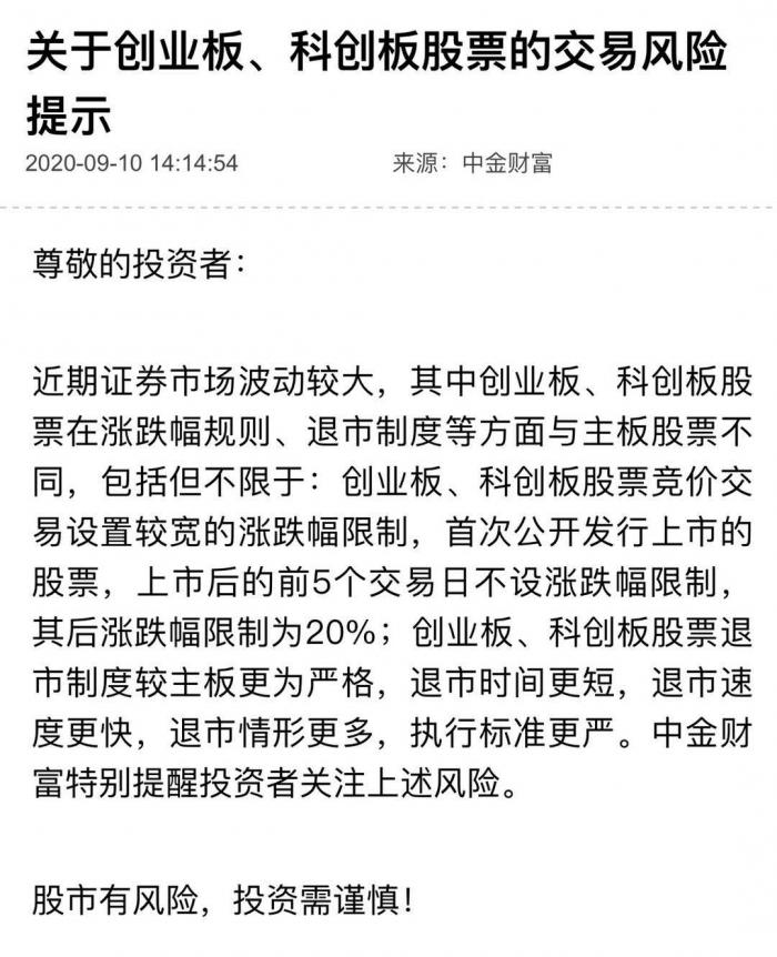 针对于近期创业板的连续大幅下跌,9月10日盘后也有券商发布特别风险提示。