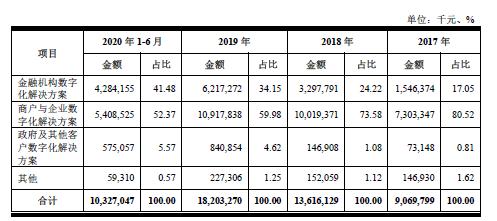 另据招股书显示,2020年1-6月,金融机构数字化解决方案和商户与企业数字化解决方案,分别占营收比为41.48%和52.37%,这两个解决方案还持续稳定增长。以金融机构数字化解决方案为例,该业务在报告期各期收入分别为15.46亿元、32.98亿元、62.17亿元和42.84亿元,年复合增长率达到100.51%。