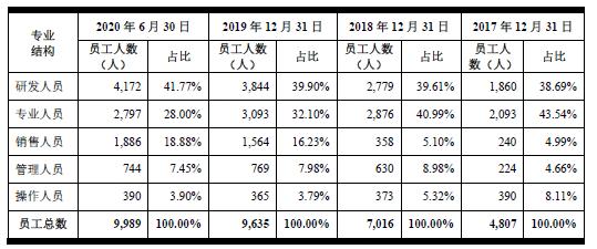 截至2020年6月30日,京东数科共有在岗员工数9989人,其中研发人员及专业人员占到公司员工总数的比例约为70%,对于科研人才的投入对标国际顶级科技公司。招股书显示,京东数科已汇集了40余位顶级科学家,主要关注前沿AI技术及产品衍生出的商业价值实践。聚集了来自全球各领域的超百位顶尖技术专家,致力于将机器学习、深度学习、知识图谱、计算机视觉、语音与自然语言处理等前沿技术实现产业级应用。