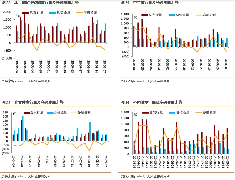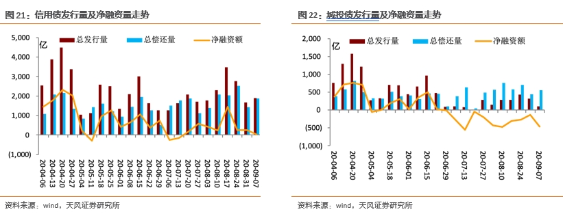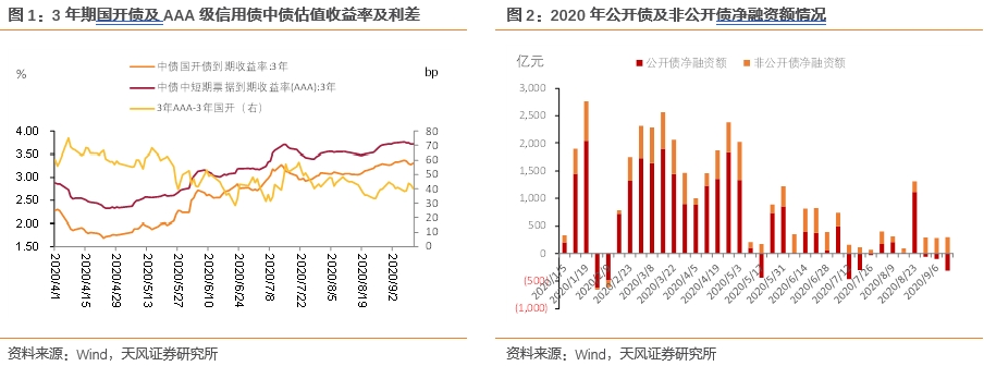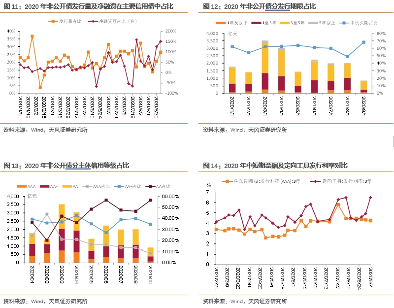 1)从发行量来看,非公开债在发行量中的占比稳中有升,对信用债市场净融资额亦贡献较大。从发行期限来看,8月中长久期债券占比曾一度下滑,但9月依然居于高位并超越此前,达到近70%。