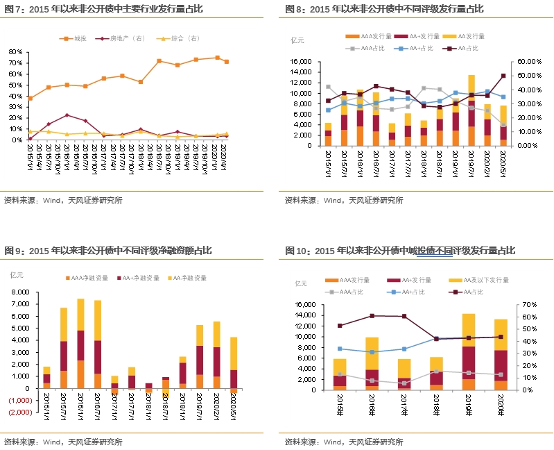 第三,虽然整体来看存量非公开债始终以中低等级为主,但2015年以来发行端实际经历了“低评级为主-高评级为主-低评级为主”的变迁。2020年5月以来AAA级发行人发行量占比仅为15%,为近年来低点,净融资额转负。