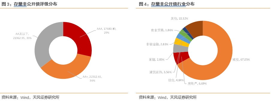 其次,城投债在非公开债发行量中的占比进一步提升。由于城投主体具有较大的融资需求,同时受益于较为宽松的政策环境,成为了非公开债的发行主力,而反观存量中占比居于二三位的房地产和综合业在发行量中的占比近年来均不足5%。