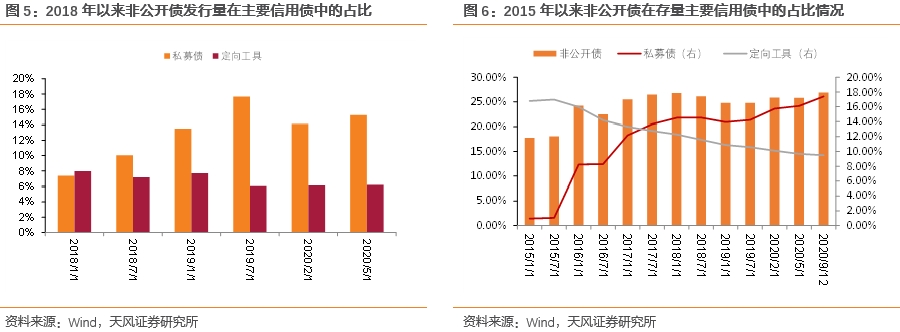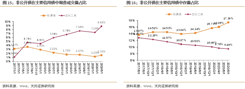 首先,虽然不同阶段有所区别,但非公开债在发行量中的占比整体提升,尤其是私募公司债的供给相对增多。去年下半年,非公开债在发行量中的占比迎来了近年来的高峰;今年2-4月发行人融资需求前置,信用债发行量及净融资量均出现大幅提升,尤其是公开债券,导致非公开债的相对占比相对下滑;5月后发行人融资刚需下降,同时优质发行人控票面要求较高,而正是这部分发行人支撑起了公募债市场,因此造成当前公募债发行萎靡,非公开债在发行及存量占比再度提升。