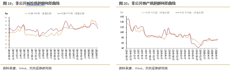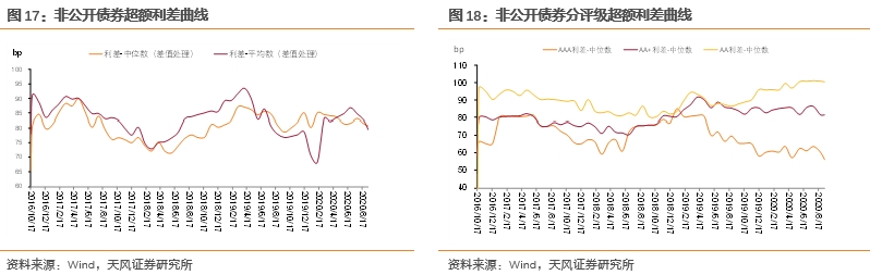 二级市场方面,2019年下半年以来,非公开债超额利差出现震荡回落,市场认可度有所抬升,当前超额利差走势未受理财整改明显影响。