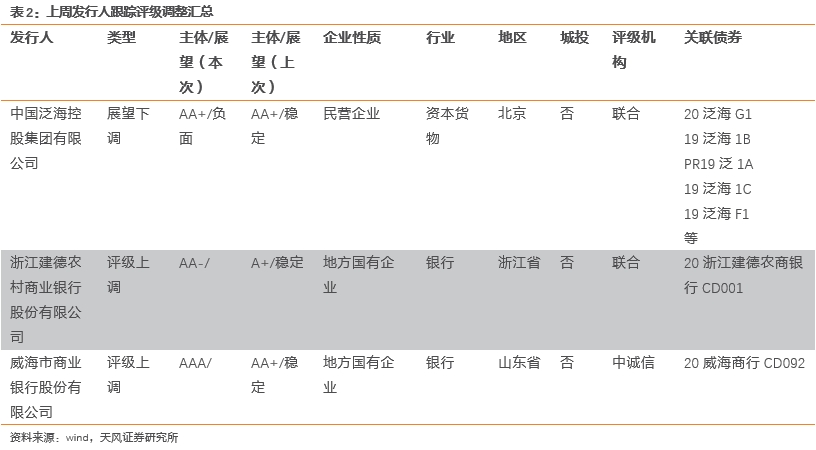 上周3家发行人及其发行债券发生跟踪评级调整,2家上调,1家下调。上周评级一次性下调超过一级的发行主体有0家。