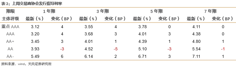 从发行利率来看,交易商协会公布的发行指导利率整体上行,各等级变动幅度在0-7BP。具体来看,1年期各等级变动3-7BP;3年期各等级变动1-5BP;5年期各等级变动0-3BP;7年期各等级变动0-1BP;10年期及以上各等级变动0-7BP。