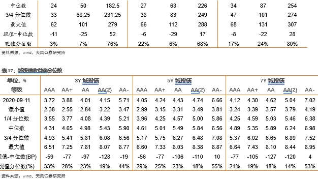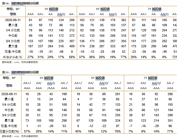 从品种来看,地产企业受政策强力约束,同时参考历史分位数,进一步压缩空间有限,应避免过度挖掘。相比之下,非公开城投债的超额利差6月以来虽已有所下降,但仍具有进一步压缩空间,更重要的是2019年下半年以来城投债的融资环境明显改善,虽然区域间差距加大,但行业基本面向好,对于负债端相对稳定的账户来说,从这一品种中选取中高等级主体仍具有较高性价比。