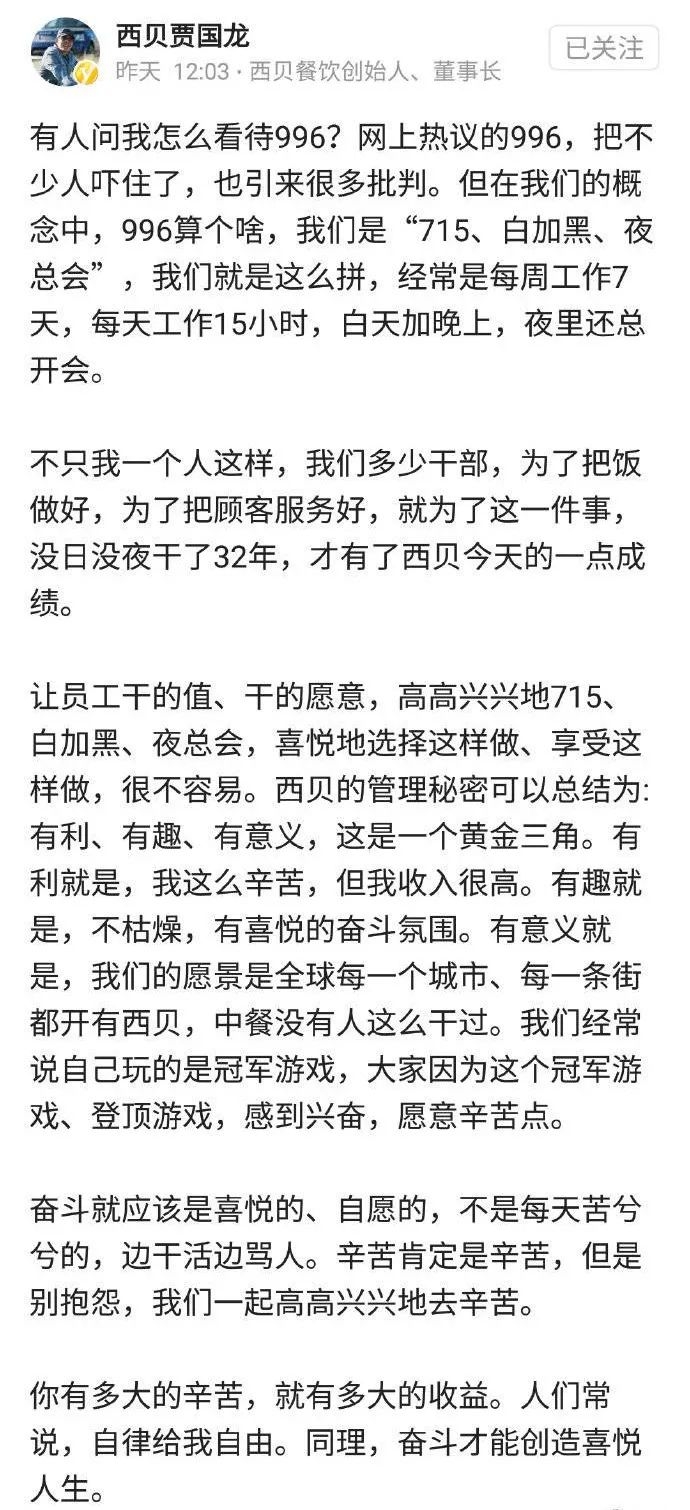 对不起,广大网友们看不到微博后半部分贾国龙要表达的原意,反而紧盯住微博前半部分的铺垫不放——但在我们的概念中,996算个啥,我们是“715、白加黑、夜总会”,我们就是这么拼,经常是每周工作7天,每天工作15小时,白天加晚上,夜里还总开会。