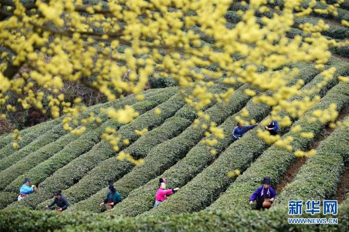 村民在贵州省丹寨县龙泉镇马寨村“扶贫茶园”里采茶(2019年3月17日摄)。新华社记者 杨文斌 摄