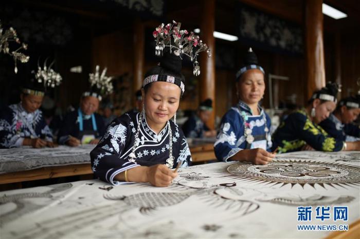 8月25日,在贵州省丹寨县龙泉镇卡拉村,村民在绘制蜡染制品。新华社发(黄晓海 摄)
