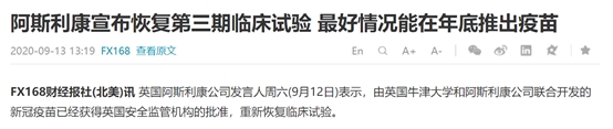 上周医药尤其是疫苗板块的回调主要是因为,周二媒体爆出一名英国临床试验参与者出现疑似严重不良反应,阿斯利康暂停了新冠疫苗三期临床试验。不过,上周六牛津大学声明称,独立评估委员会认为继续为人们接种疫苗是安全的,英国已经重启了三期临床。阿斯利康CEO上周四表示,如果试验能够迅速恢复,疫苗仍然有望在今年年底、明年年初研制成功。