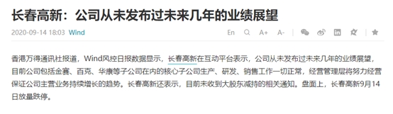 但傍晚长春高新已在互动平台澄清,公司未发布过未来几年的业绩展望,未收到相关股东减持意向通知。