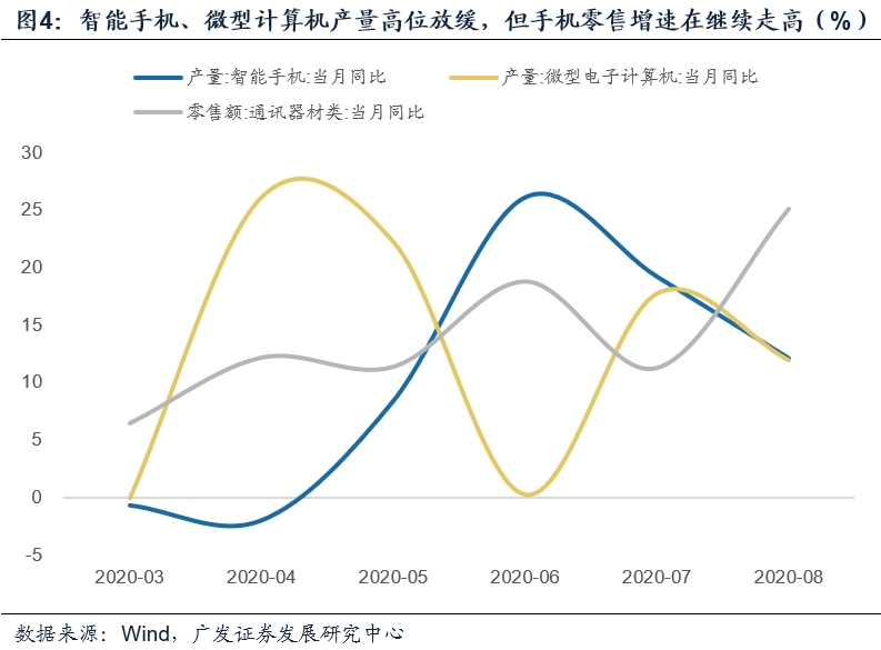 第二,从主要工业行业来看,一是中游行业(通用设备、电气机械)继续维持高增,二是原材料类(黑色、有色、化工、水泥)产量和增加值普遍上升;三是智能手机、微型计算机产量高位放缓,计算机通讯电子增加值增速有所回落,但实际上手机零售增速在继续走高;四是食品制造、农副食品加工增速均低位继续回落。