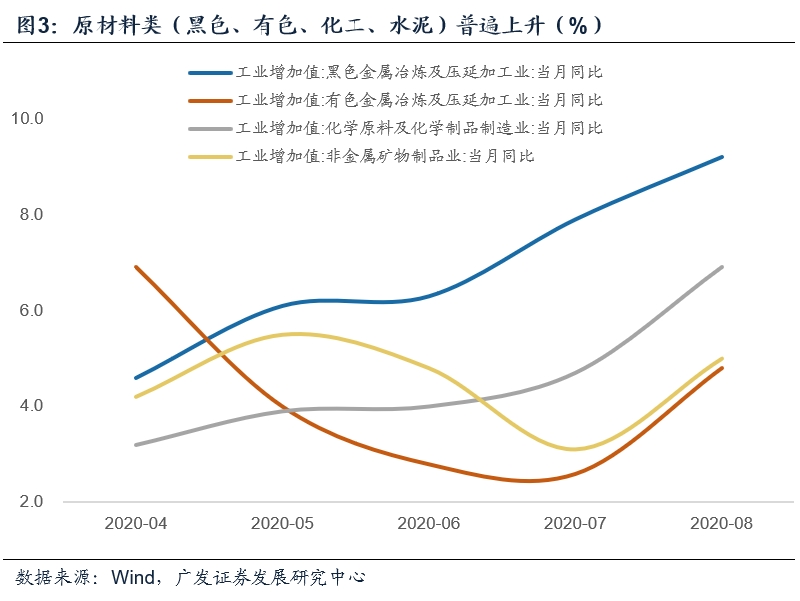 二是上中游原材料和建材类,黑色冶炼、有色冶炼、化学原料及化学制品、非金属矿造(水泥玻璃等)四个行业工业增加值分别回升1.3、2.2、2.2、1.9个点。