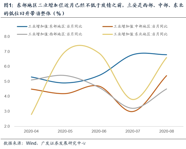 第一,工业增加值8月进一步回升至疫情后的新高。从区域结构看,东部地区近月已经不低于疫情之前,本月高位持平;主要是西部、中部、东北的低位回升带动整体。