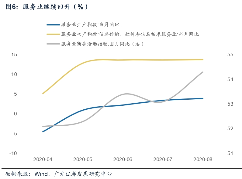 8月服务业生产指数同比为4.0%,较上月的3.5%继续回升。其中信息传输、软件和信息技术服务业13.8%,前期已在高位,本月比7月加快0.1个点,房地产业,交通运输、仓储和邮政业生产指数同比分别增长9.4%、3.3%,分别较7月加快1.6、1.2个点。8月服务业商务活动指数为54.3%,比7月上升1.2个点。其中住宿、餐饮、文化体育娱乐等行业呈现回暖迹象,商务活动指数均高于57.0%。