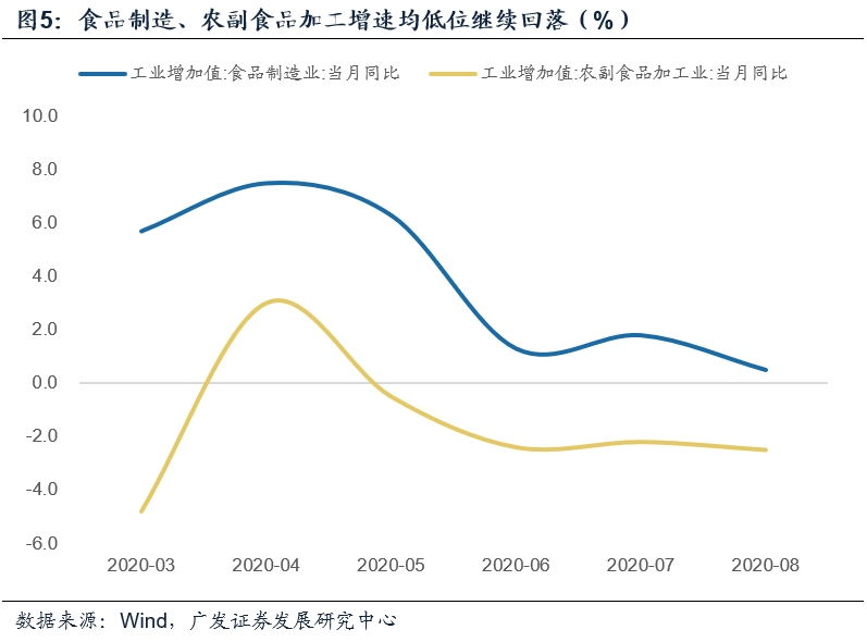 四是食品制造、农副食品加工行业,增速分别为0.5%、-2.5%,分别回落1.3、0.3个点。