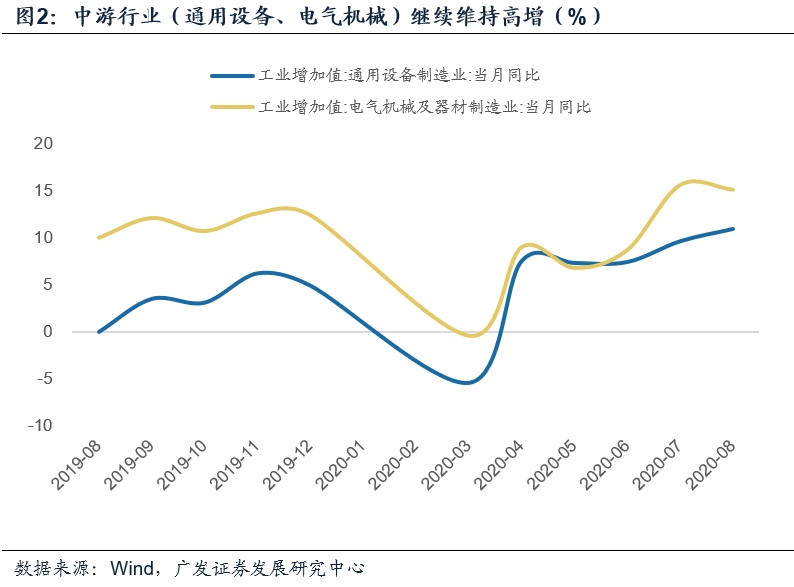一是中游行业,通用设备行业增加值增速为10.9%,显著快于上月的9.6%;电气机械增加值增速为15.1%,略低于上月的15.6%,但维持高位。