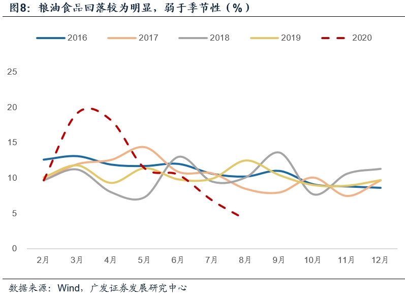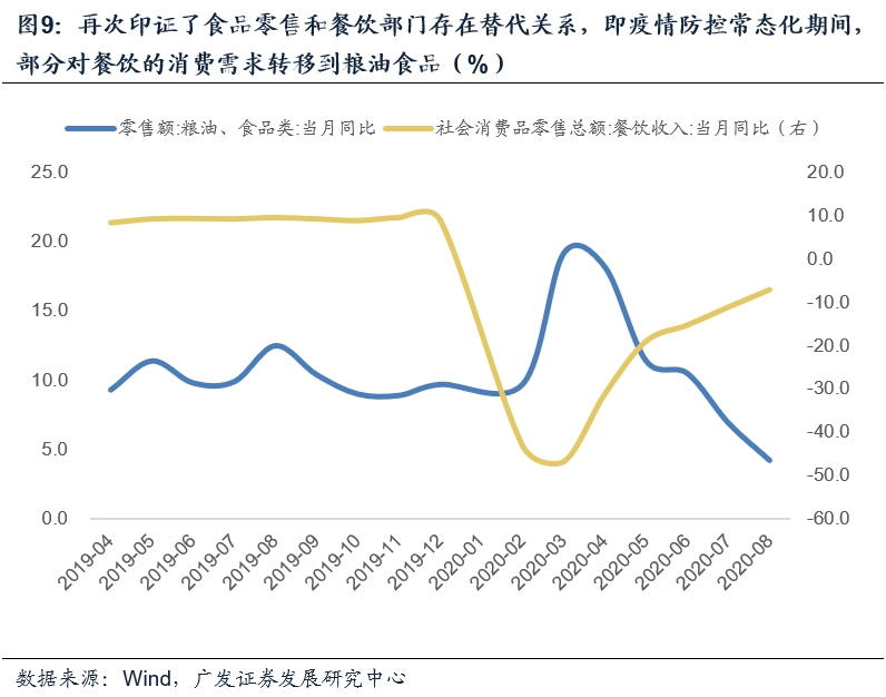 其中粮油食品类增速为4.2%,显著低于上月的6.9%,自3月高位后已属连续第五个月回落,本月表现亦弱于季节性。同期餐饮部门收入在继续上升,本月回升4个点至-7%。这似乎再次印证了食品零售和餐饮部门存在替代关系,即疫情防控常态化期间,部分对餐饮的消费需求转移到粮油食品;在复苏的过程中则相反。