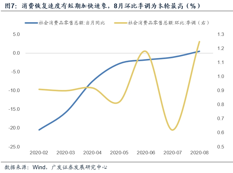 社会消费品零售总额同比为0.5%,较上月加快1.6个点(6月和7月分别为1.0、0.7个点)。环比季调增速为1.25%,超过6月成为本轮以来最高,也显著高于疫情之前的环比。这意味着消费恢复速度确有短期加快迹象。