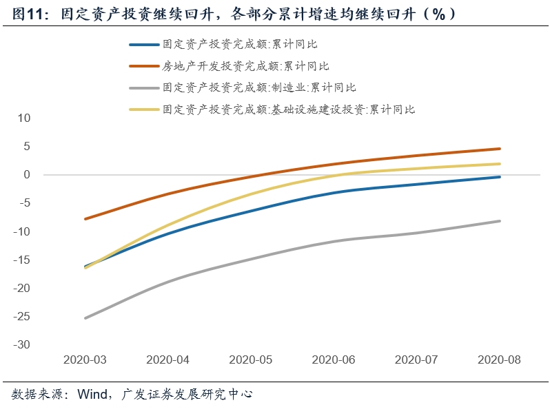 固定投资累计增速从7月的-1.6%回升至-0.3%,其中制造业投资累计增速从-10.2%升至-8.1%,地产从3.4%升至4.6%,基建从1.2%升至2.0%。
