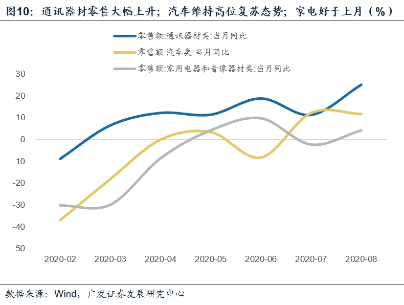 消费恢复速度有短期加快迹象,8月环比季调为本轮最高。其中粮油食品回落较为明显,弱于季节性,似乎再次印证了它和餐饮部门存在替代关系。对其他部分来说,通讯器材零售大幅上升;汽车维持高位复苏态势;家电好于上月。