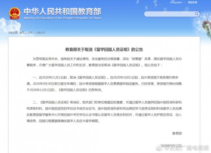 9月17日,教育部发布公告,决定自今年11月1日起,取消《留学回国人员证明》。自2020年10月1日起,驻外使领馆不再受理开具申请。2020年9月30日前已提交申请的,驻外使领馆根据留学人员意愿提供相应服务。已经受理、使领馆开具时间晚于2020年11月1日的,《留学回国人员证明》仍然有效。